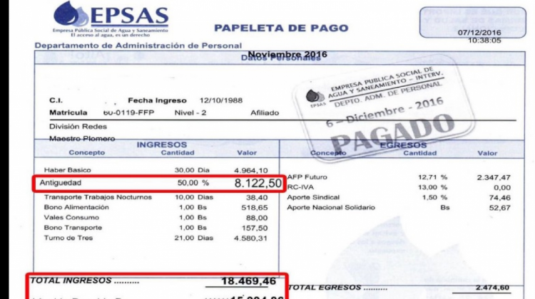 Jugosos bonos hacen que un plomero de EPSAS gane Bs 18 mil y un operador 19 mil al mes