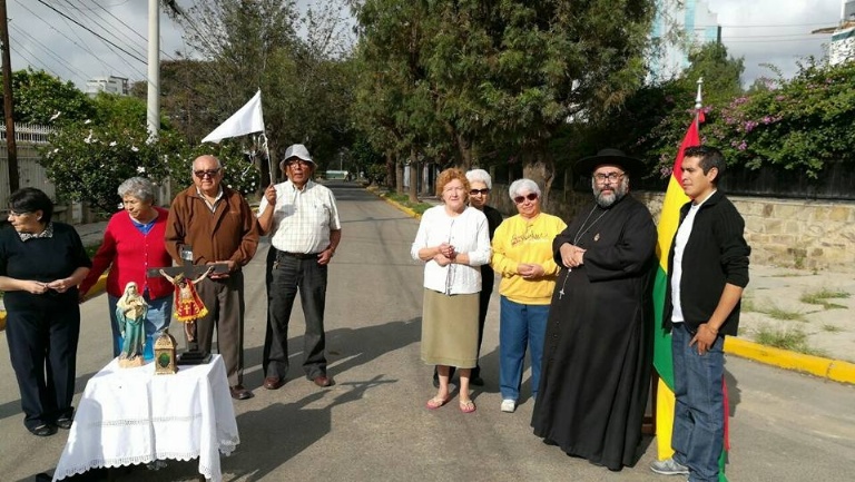 Con las imágenes de Cristo crucificado y la Virgen María sobre su pequeña mesa, así salió a la calle el sacerdote Marcelo Bazán, rector de la Catedral Metropolitana de Cochabamba, en apoyo al paro convocado para hoy en contra del Código del Sistema Penal y la reelección del presidente Evo Morales.
