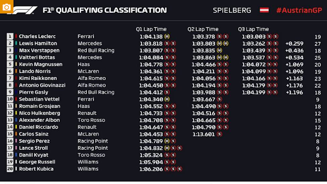 Sanción de tres puestos para Lewis Hamilton en la parrilla de Austria, del segundo al quinto, por molestar a Raikkonen en la Q1 de la clasificación cuando el finlandés intentaba marcar una vuelta rápida. El castigo lo anunció el propio Lewis en Instagram. Saldrá tras Leclerc, Verstappen, Bottas y Norris.