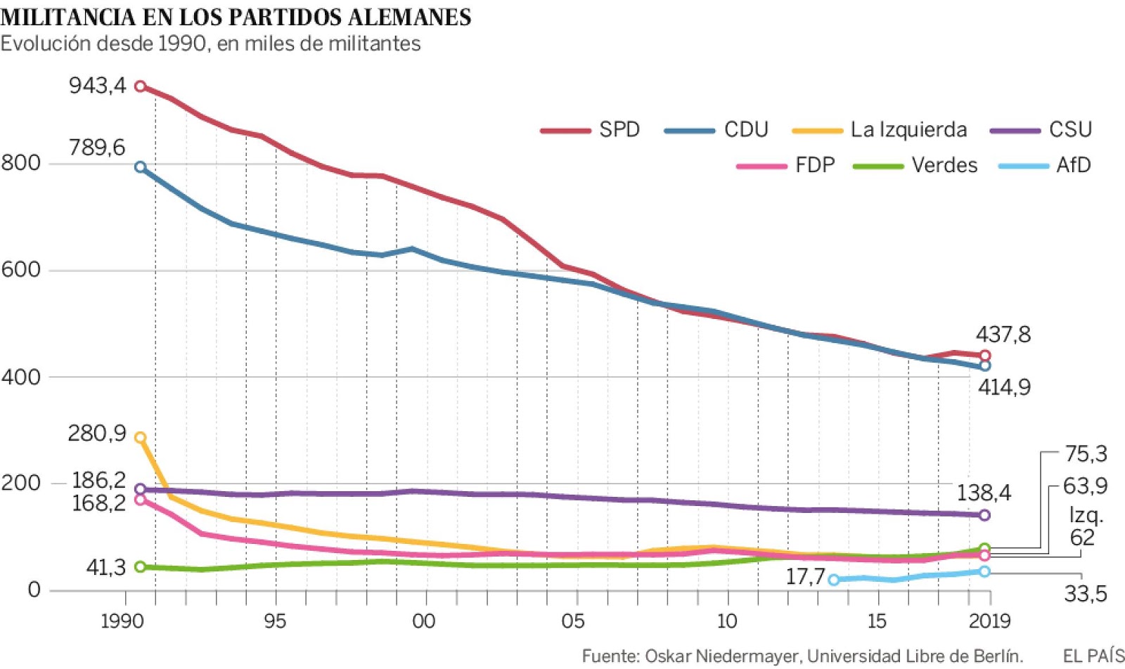 En general, la caída de los afiliados a los grandes partidos es una constante. “Observamos un continuo declive de la adhesión social al sistema de partidos”, interpreta Oskar Niedermayer, el autor del estudio. “Si miramos al periodo a partir de 1990, todos los partidos a excepción de Los Verdes y AfD [Alternativa para Alemania, de extrema derecha] han perdido militantes”, añade. En total, la pérdida asciende a casi el 50% de los miembros que tenían a principios de los noventa.
