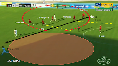 Añez y Morales corren tras la pelota, donde se amontonan defensas y descuidan totalmente el carril opuesto, donde Ballivián no aparece. El retroceso es deficiente |