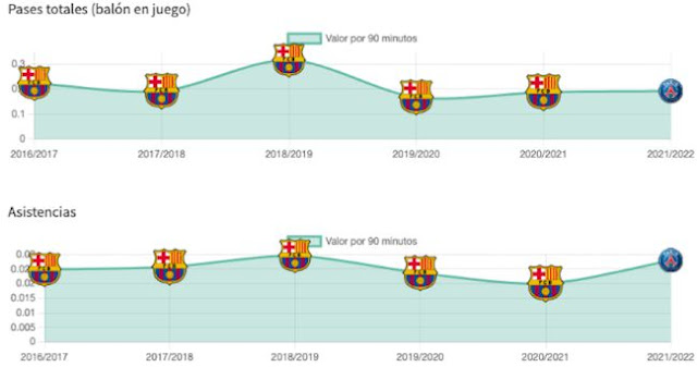 El argentino está sabiendo reciclarse, incrementado cuantitativame y cualitativamente su faceta como constructor del juego e implicación defensiva. Esta última es la única del juego del astro argentino que ha mejorado respecto a su desempeño como blagurana. Un Messi más al servicio del equipo. Que suple su falta de inspiración y precisión con implicación...y asistencias. Ahí sigue siendo el rey. Con diez, a la par que Mbappé, es el jugador que más goles regala de la Ligue 1. Por ello, Pochettino le sacó de la banda derecha para ubicarle cerca de la base neurálgica de la jugada. Aunque sigue siendo menos que