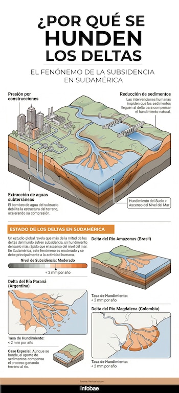 El delta del río Magdalena, en Colombia, muestra subsidencia, aunque menos marcada que en Amazonas y Paraná. El estudio señaló que en el Magdalena “también se observa subsidencia, aunque los científicos no lo destacan como un proceso extremo”.